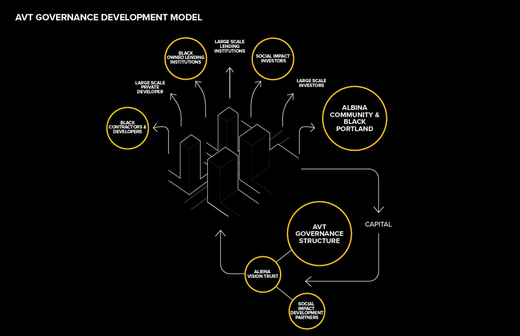 The Albina Vision Community Investment Plan (AVCIP) aims to illustrate how a community anchored in sustained affordability, livability, and diversity can provide value to Lower Albina. Moreover, it will authentically involve the community in shaping a place that serves their needs while simultaneously considering financially feasible strategies for accomplishing this work over time.