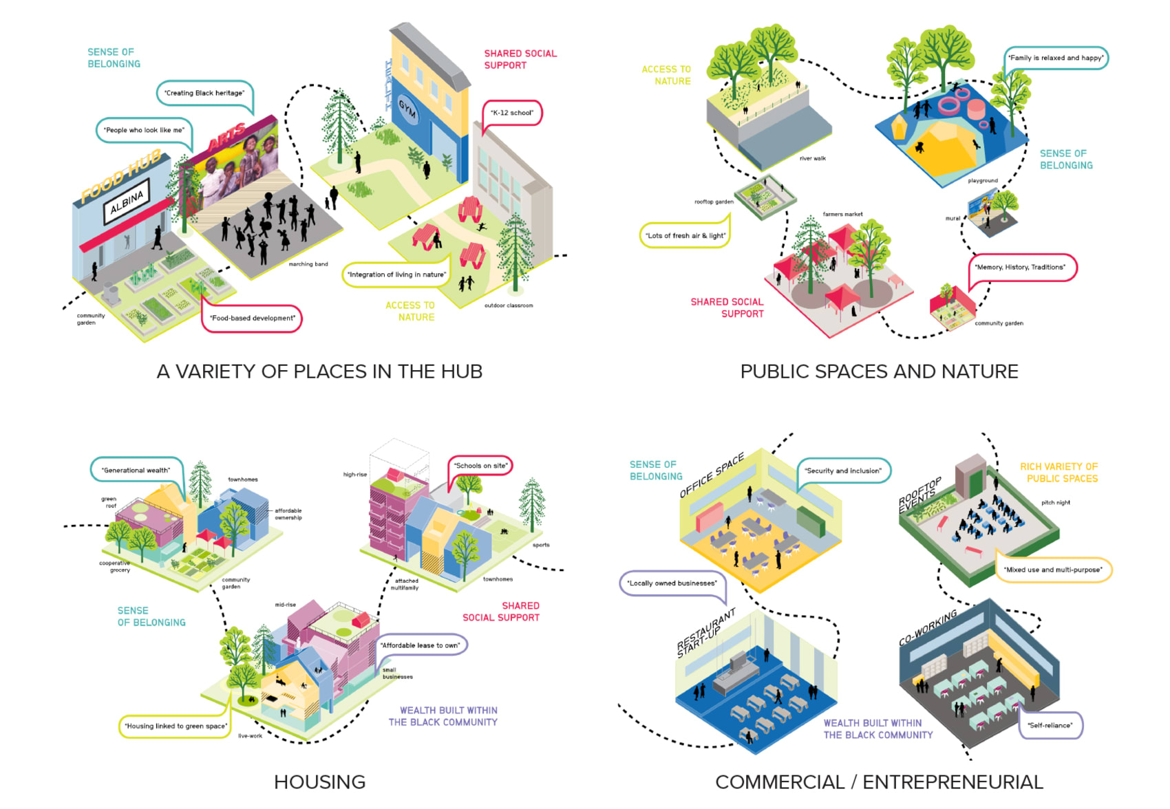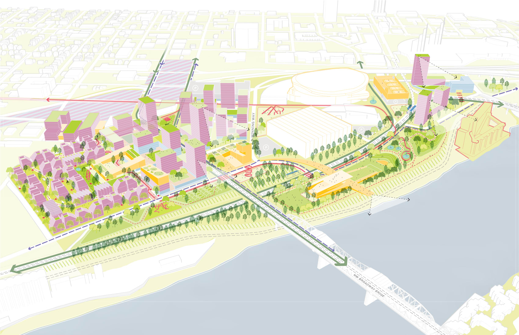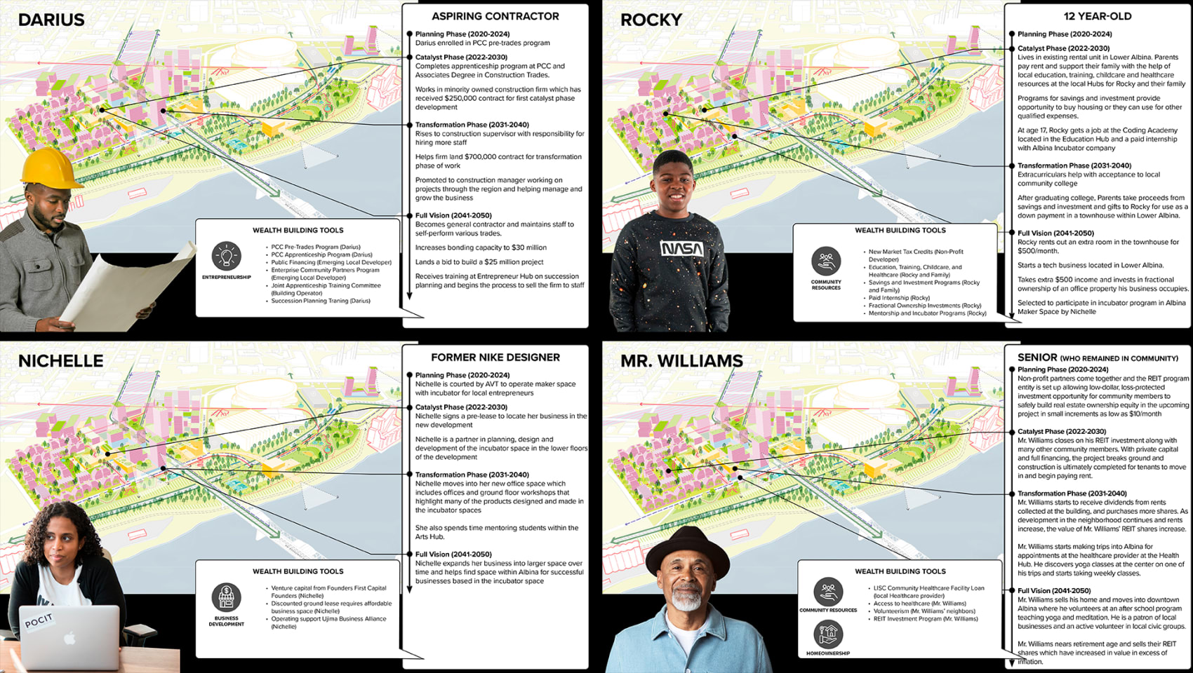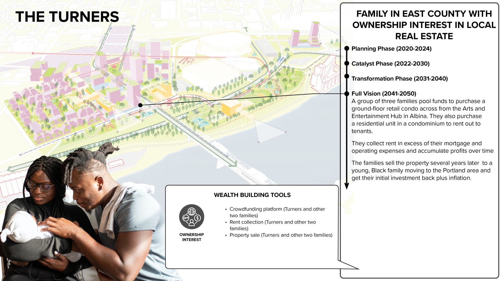 The Albina Vision Community Investment Plan, initiated by Albina Vision Trust Inc. (AVT), seeks to create a vision and framework for an inclusive community while healing the wounds of previous urban development that displaced and disempowered Portland’s Black community. A wide range of community partners have worked to produce a development vision that lays the groundwork for investment in a diverse community. The vision is anchored by equitable public park spaces that seamlessly connect to the river and its surrounding neighborhoods. It is time to take the next step and transform the vision into action, coordinating and integrating community values and intentions with needed public, private, and community investment.