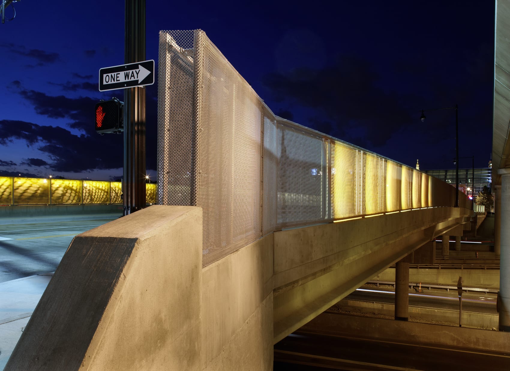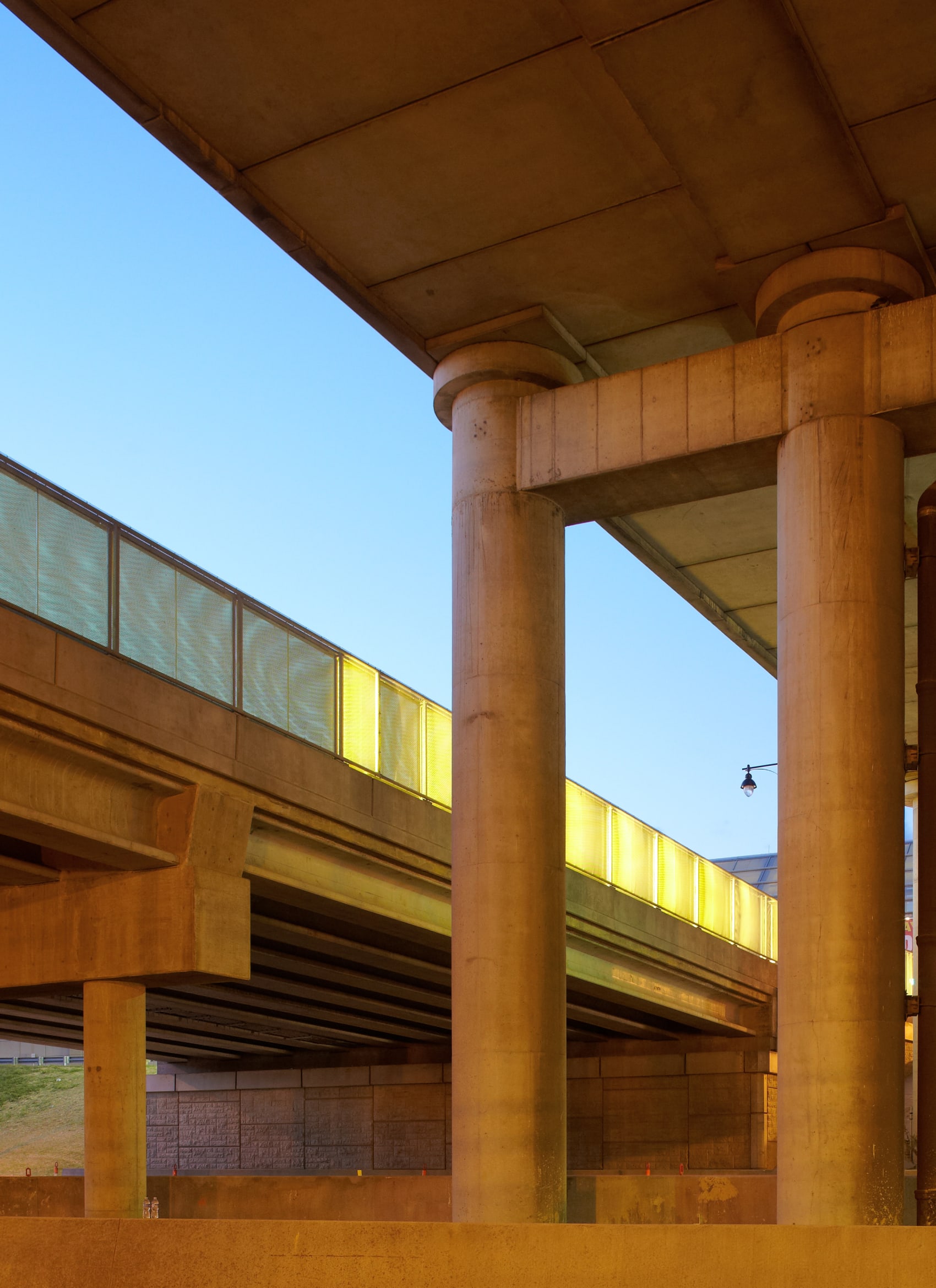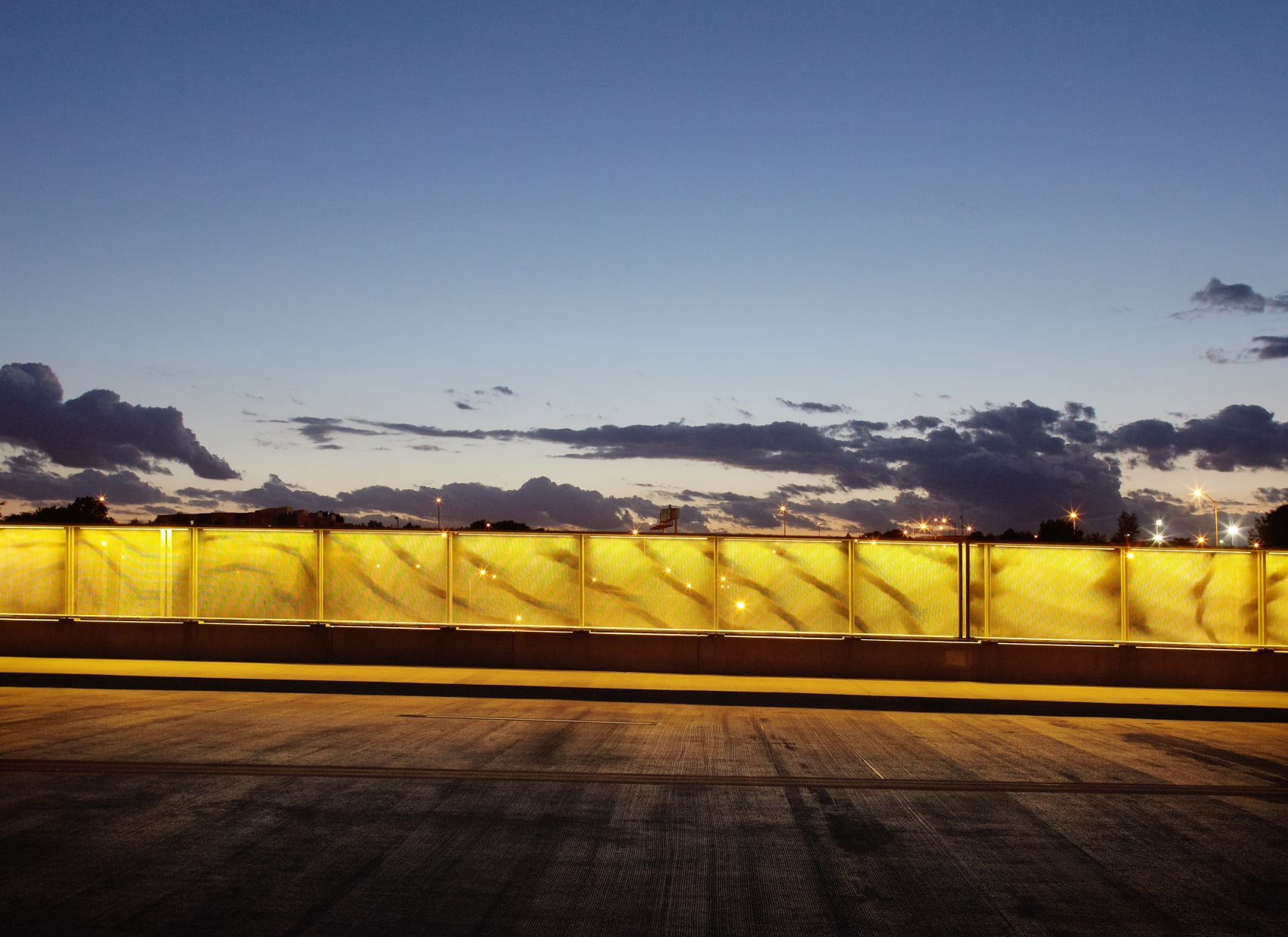As part of the third installation of Unlooping the Loop, lighting artist Derek Porter proposed weaving light, color, and varying sizes of stainless steel mesh to create a pedestrian guardrail that, at dusk, comes to life as a lively moiré! This low tech graphic animation strategy creates an endless loop of patterns and movement, all dependent on the vantage point of the viewer. The graphic display unfolds slowly as a series of stills while walking, but transforms to an active set of shifting hatches at driving speed. From the interstate below, the moiré patterns take shape as an illusion at urban scale, creating a dynamic gateway to the city from Interstate 670.