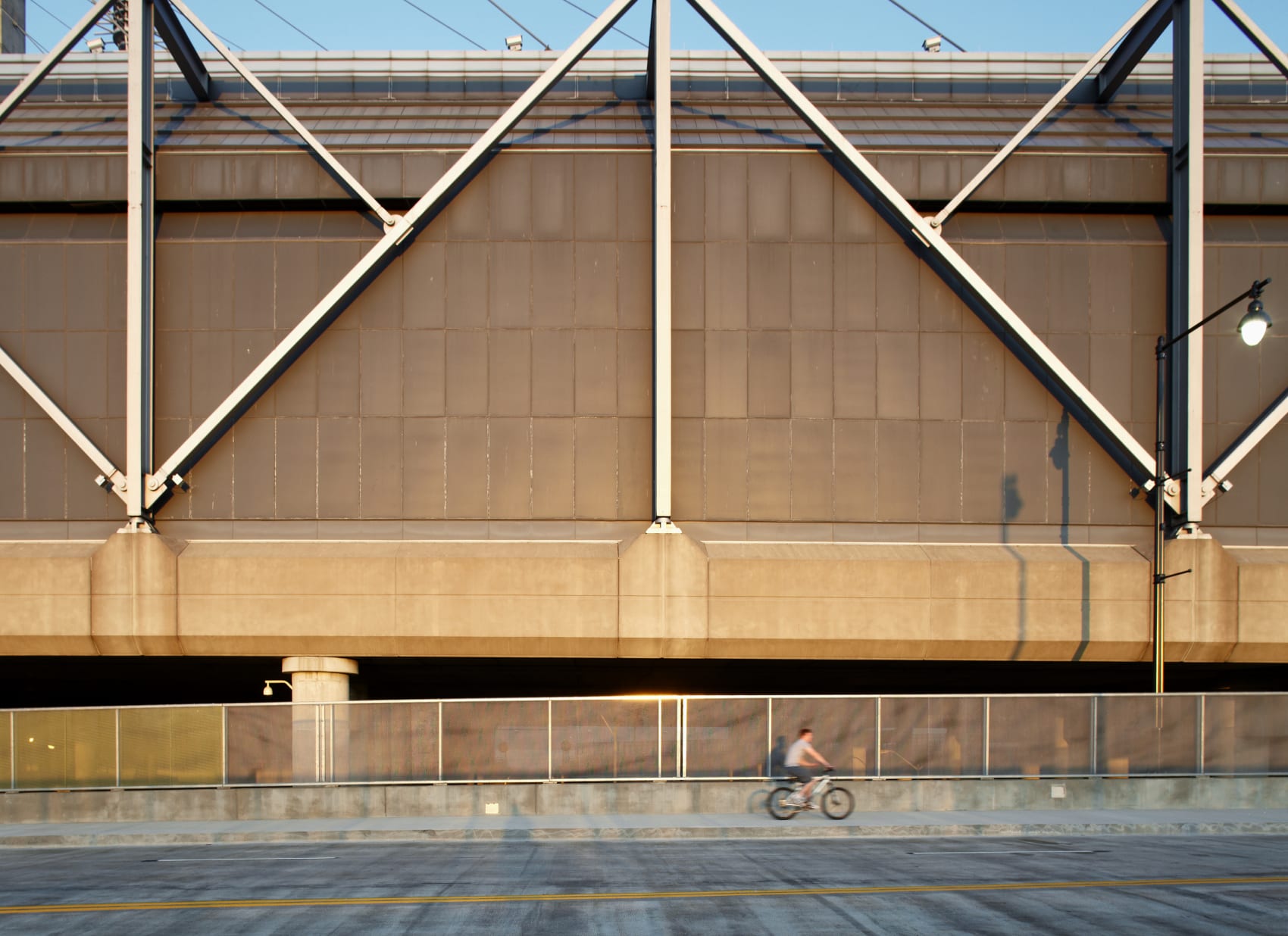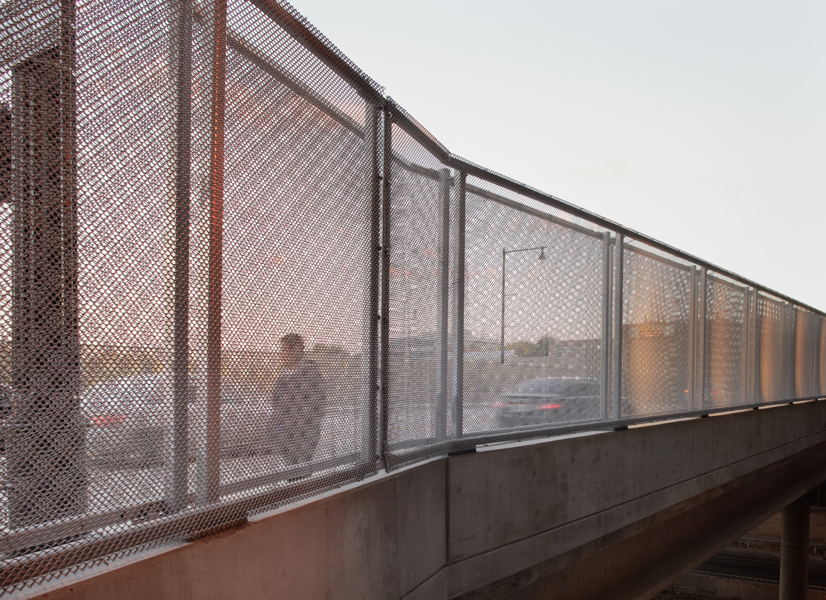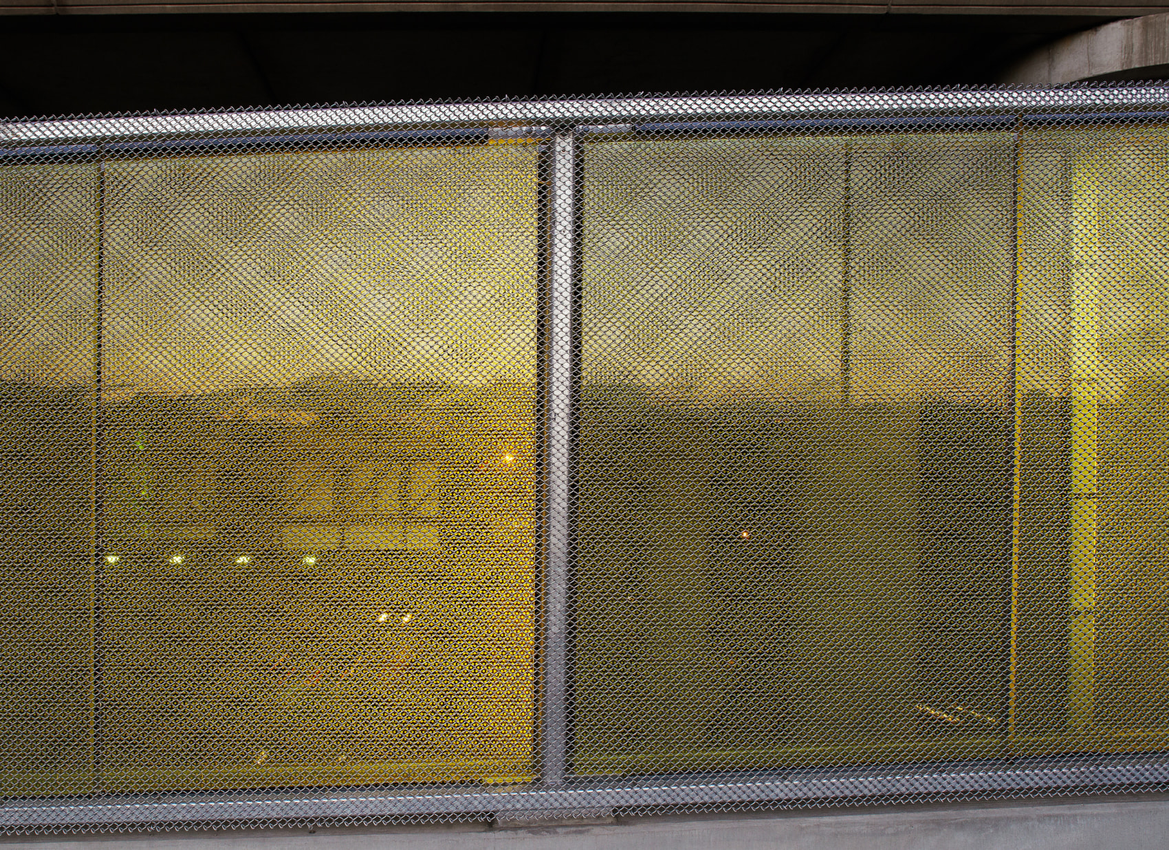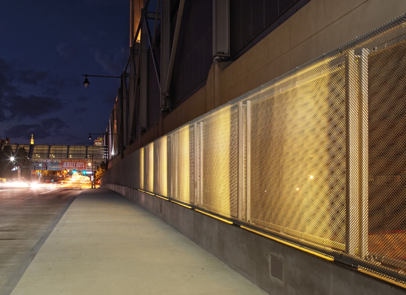 As part of the third installation of Unlooping the Loop, lighting artist Derek Porter proposed weaving light, color, and varying sizes of stainless steel mesh to create a pedestrian guardrail that, at dusk, comes to life as a lively moiré! This low tech graphic animation strategy creates an endless loop of patterns and movement, all dependent on the vantage point of the viewer. The graphic display unfolds slowly as a series of stills while walking, but transforms to an active set of shifting hatches at driving speed. From the interstate below, the moiré patterns take shape as an illusion at urban scale, creating a dynamic gateway to the city from Interstate 670.