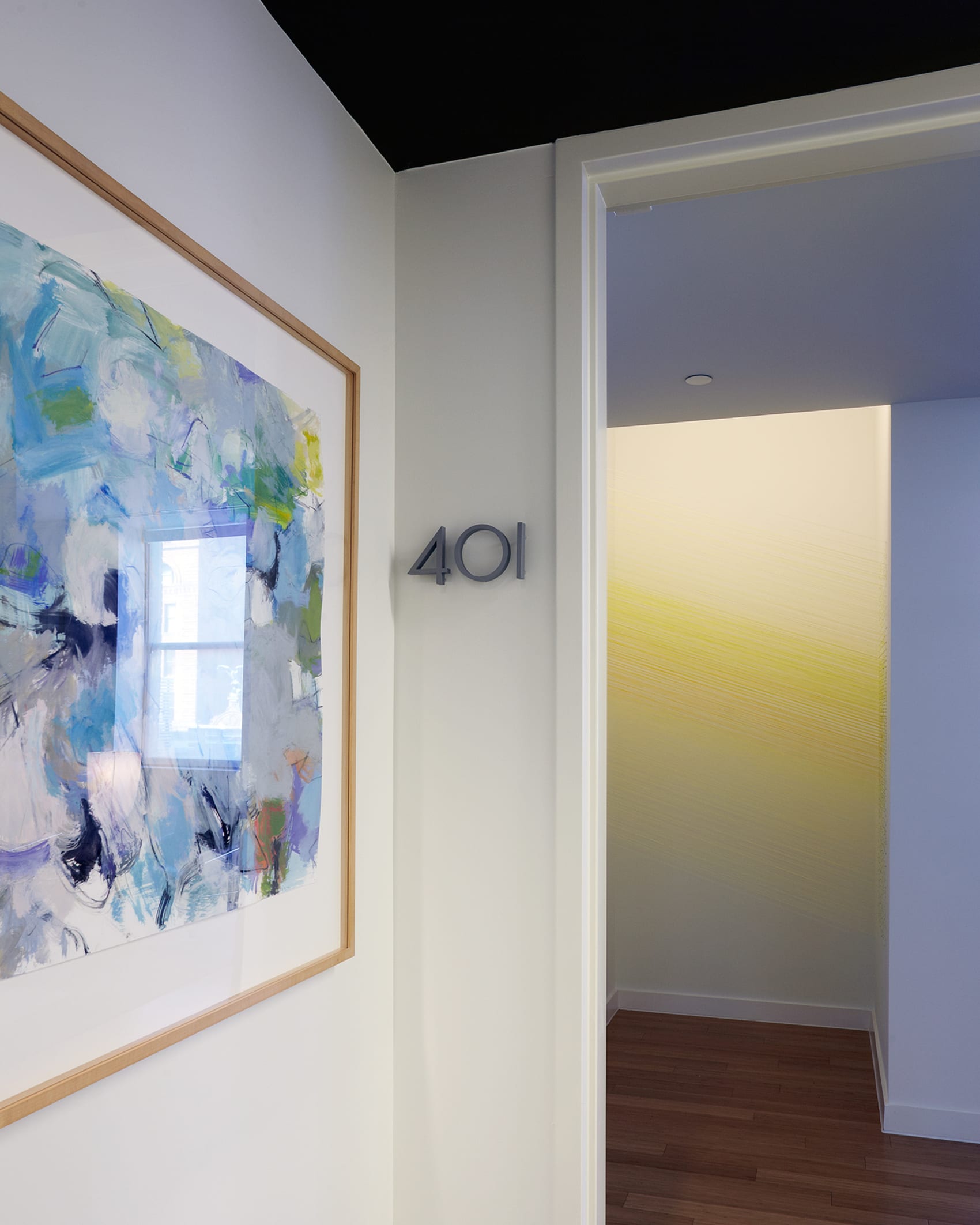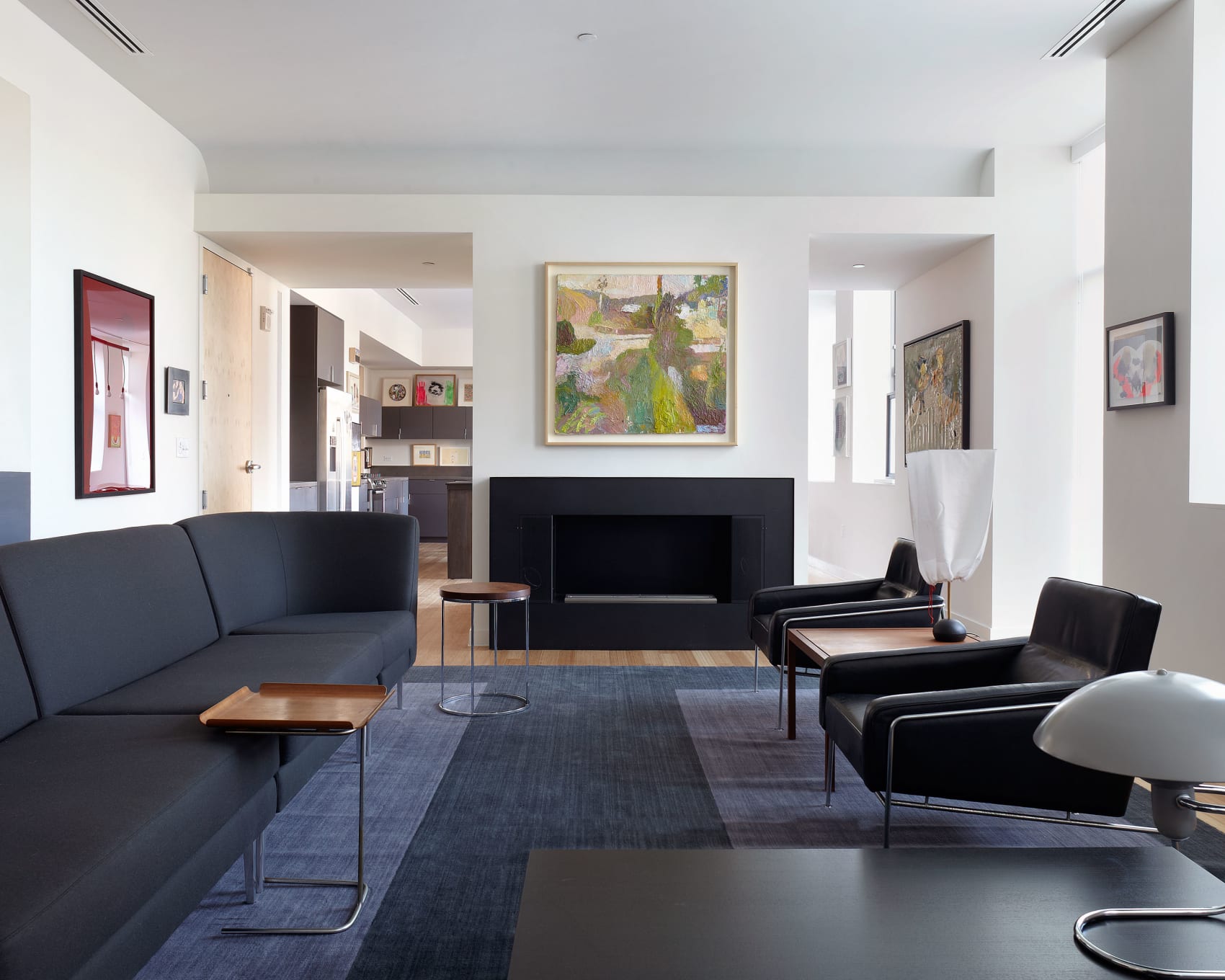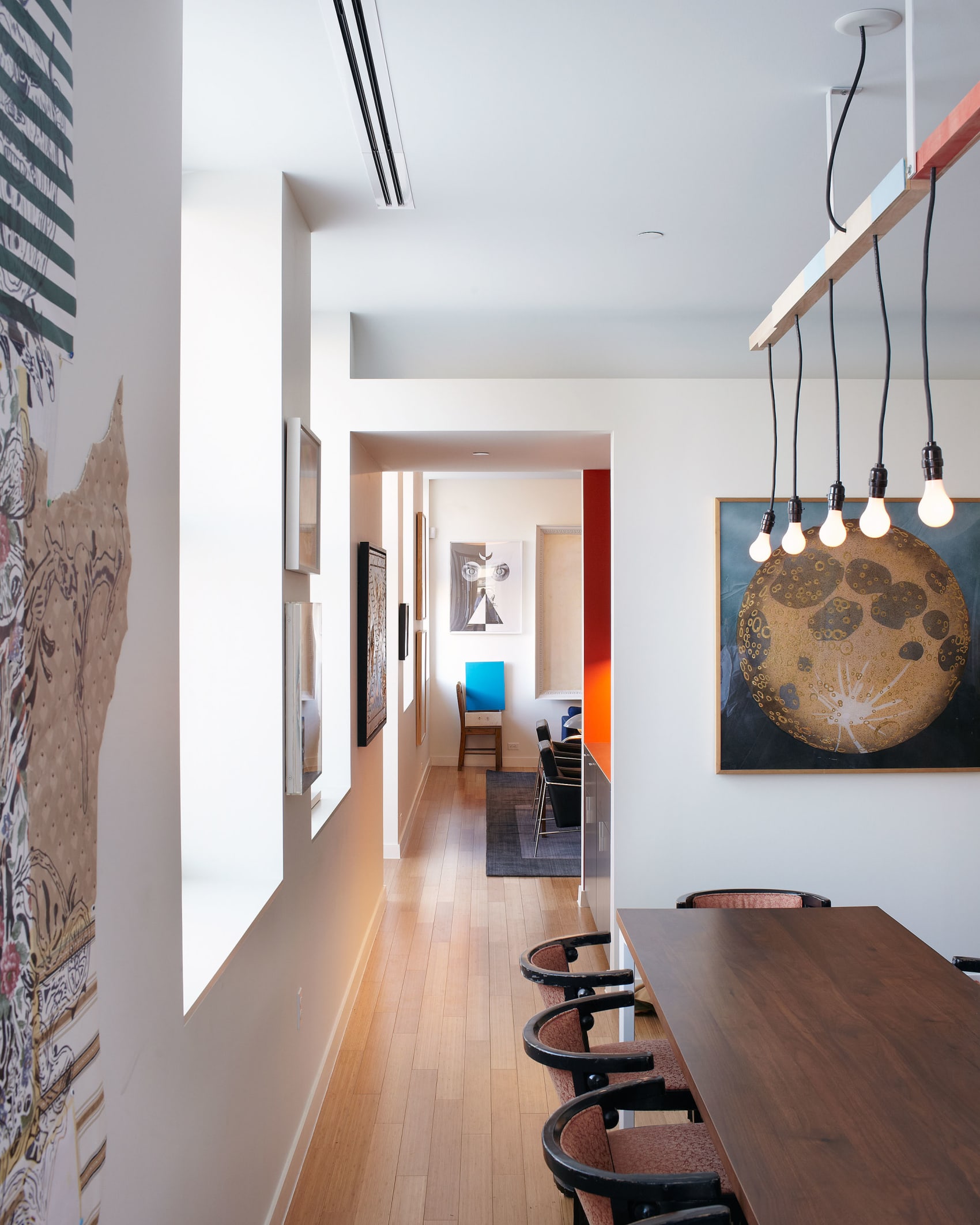 We worked closely with John O’Brien (owner of the Dolphin gallery), and David himself throughout the design process. Derek Porter Studio developed ambient lighting strategies in response to the abundance of diffuse north sunlight in the condo. Anne Lindberg created a site-specific installation at the entry vestibule and James Woodfill designed and fabricated a pendant lighting system for the dining room. Finally, El Dorado designed and fabricated various custom components for the condo, including a steel fireplace system, a dining table and a built-in desk.