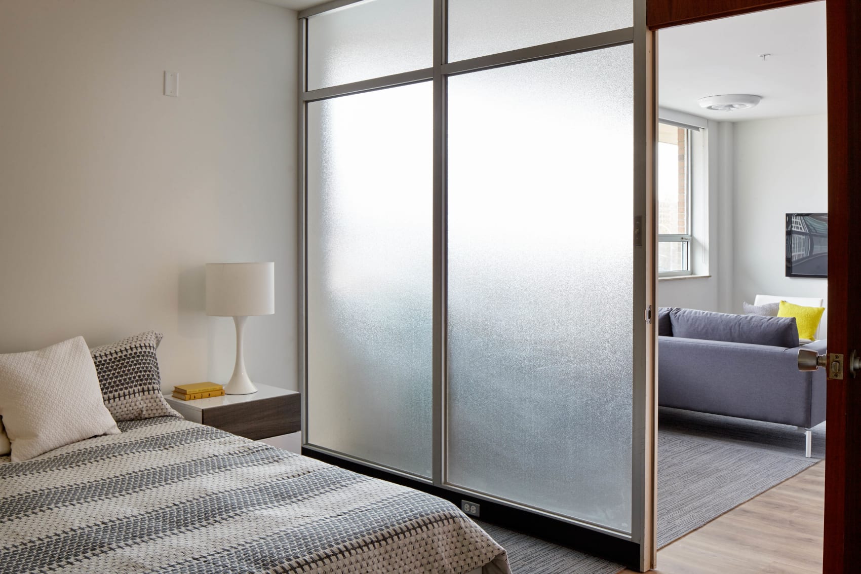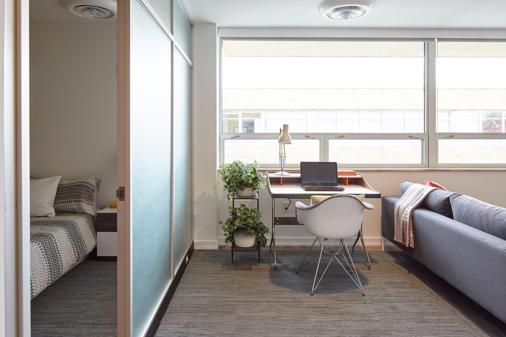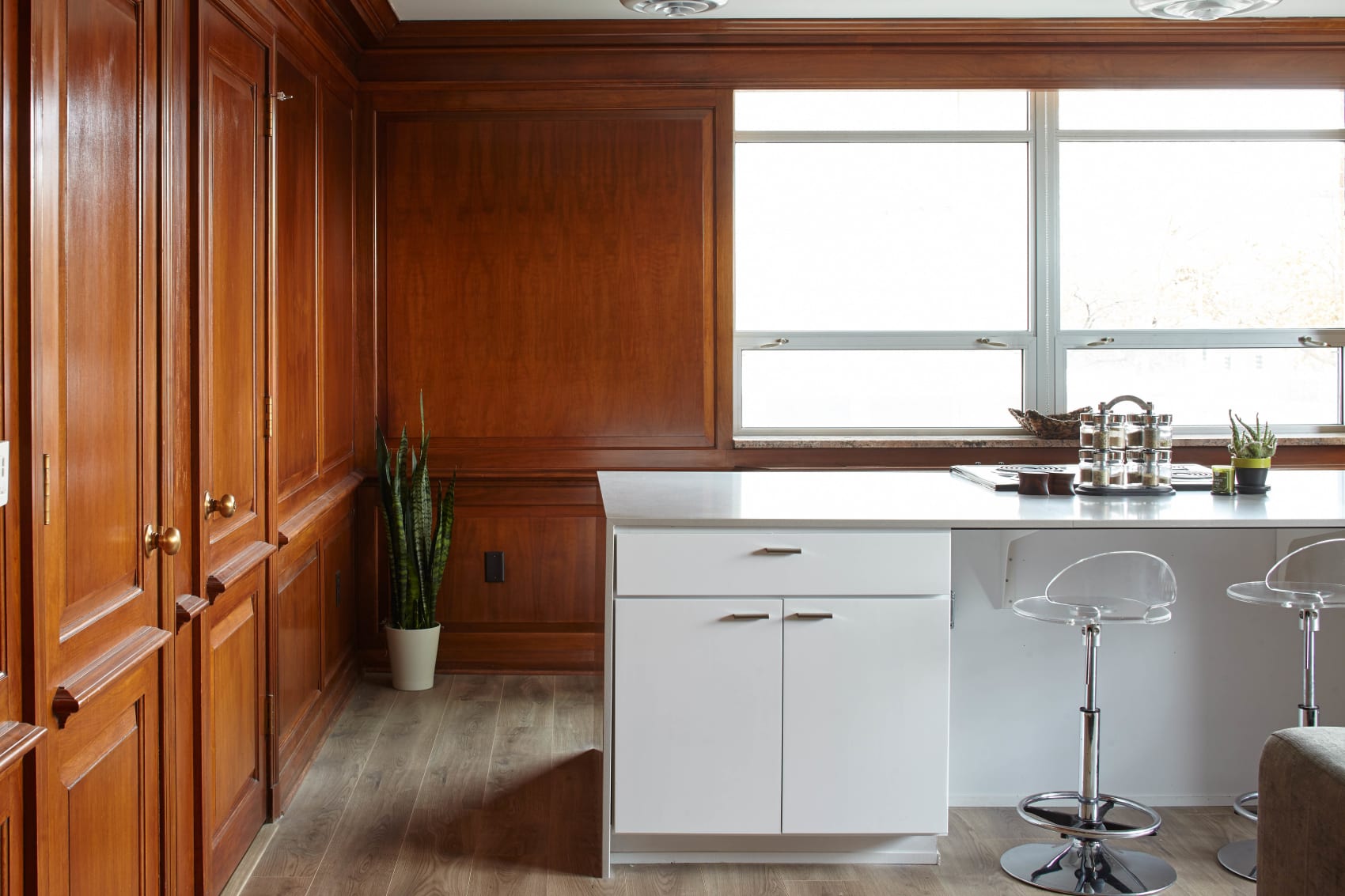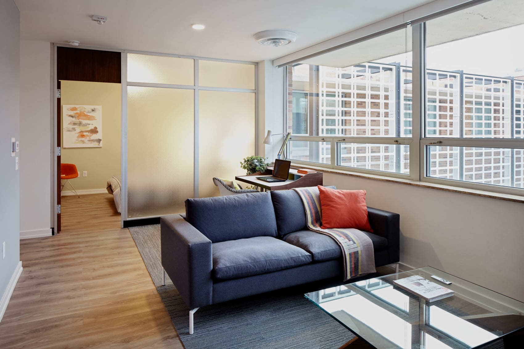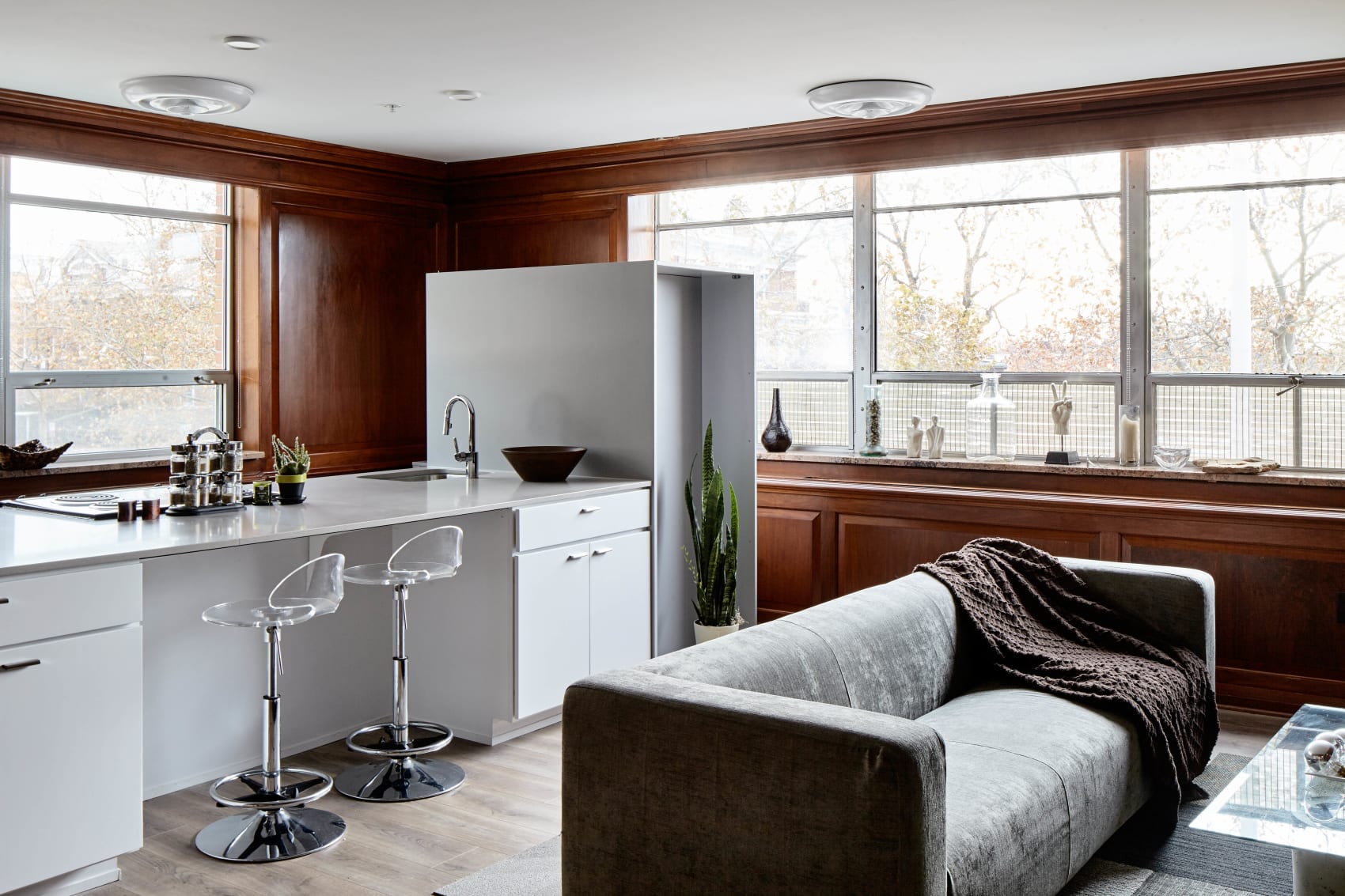 Innovative re-purposing of existing assets played a key role in the re-design—salvaging vintage glass partitions and doors, retaining key components of the existing light fixture design, restoring the solar screens, and renovating the automobile courtyard into the common area amenity spaces. The result is an elegant retrofit of a modernist structure.